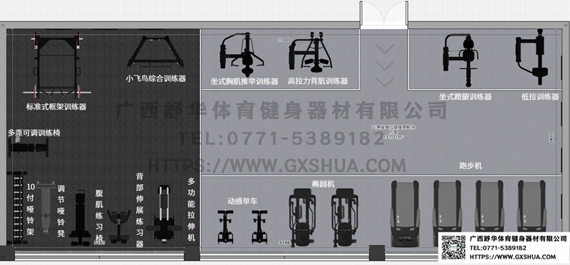 此方案要求面积小于132m²,适用于企事业单位、酒店会所、楼盘社区、学校等健身场所,能满20-30人同时健身使用。(方案根据场地空间大小、预算、产品需求等进行配置仅为启发性参考)