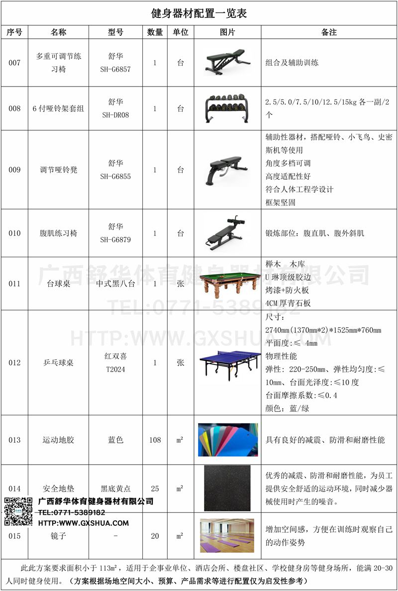 此方案要求面积小于113m²,适用于企事业单位、酒店会所、楼盘社区、学校健身房等健身场所,能满20-30人同时健身使用。(方案根据场地空间大小、预算、产品需求等进行配置仅为启发性参考)