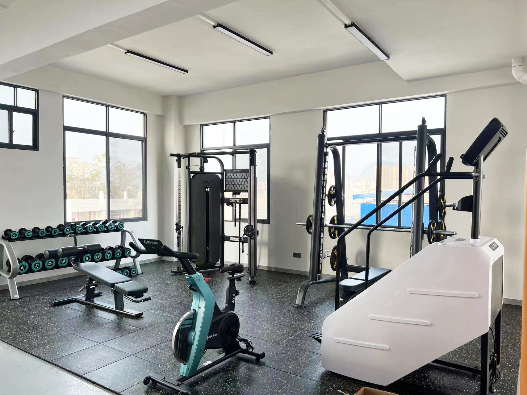 力量器械配置了星空xk可调式双滑轮多功能训练器(小飞鸟)SH-G6820、史密斯机训练架SH-G6853、腹肌练习椅SH-G6879 、康健10付哑铃套组,依据锻炼方式不同,能够满足日常多肌群训练(胸、肩、背、腿),让企事业职工在有限的器材里能够得到全方位锻炼身体肌肉。让职工身体更健硕,在工作中释放激情活力,打造完美职场形象。在运动过程中增进职工之间的情感交流,促进各部门紧密融合,增强职工归属感,增强企事业的凝聚力。